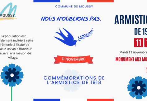 Cérémonie de commémoration de l’Armistice de 1918 Mardi 11 novembre 2025 à 11h Monument aux Morts – Commune de Moussy La commune de Moussy organise, comme chaque année, une cérémonie en hommage aux soldats tombés pendant la Première Guerre mondiale. Cet événement...